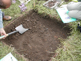 Trench at 30 cms [half way down]. Note the soil changes colour at this depth. From the rich plough soil to a sandy clay colour. |